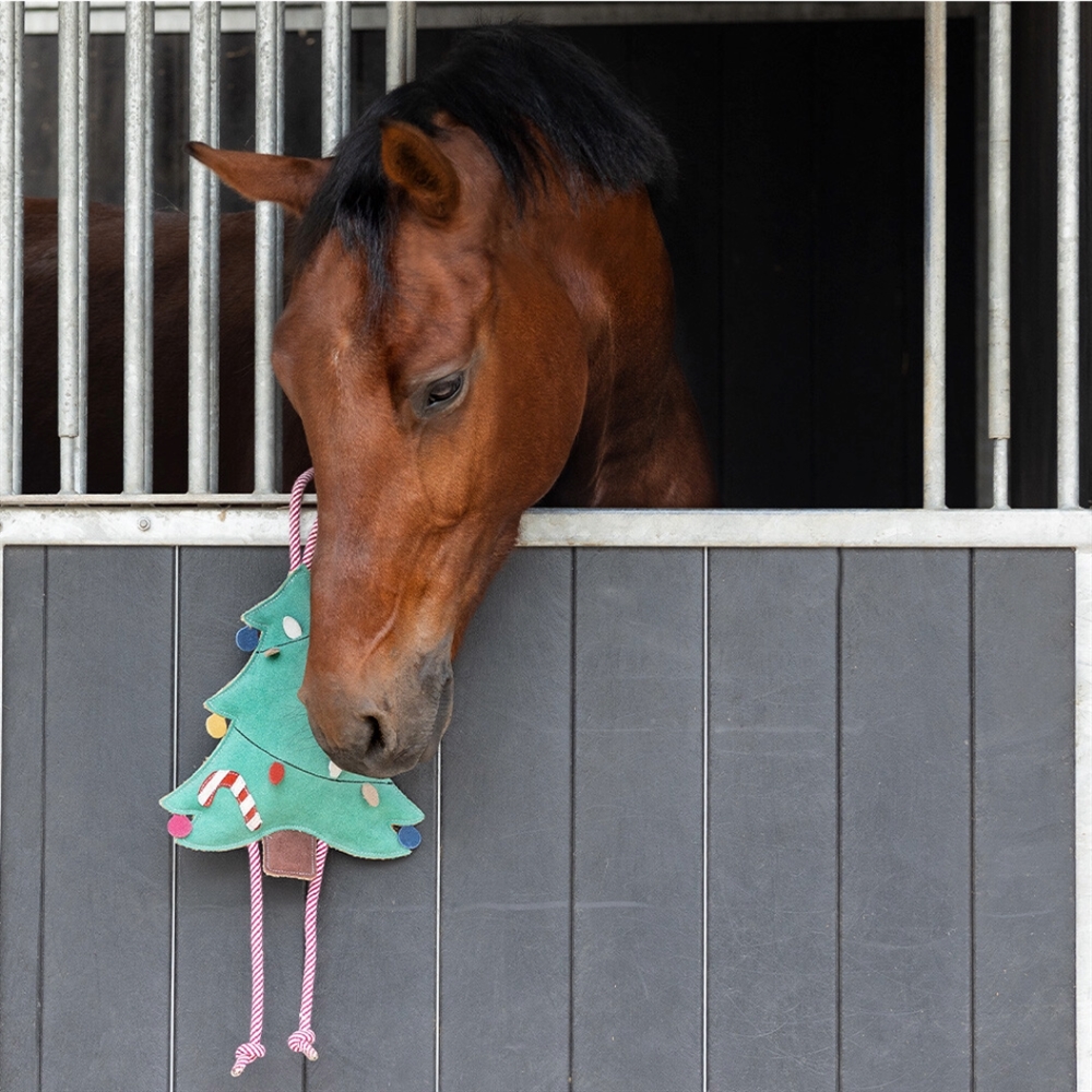 Deze schattige kerstspeelgoedvriend van QHP is de perfecte tijdverdrijf voor paarden die zich snel vervelen in de stal. Het speelgoed wordt opgehangen en je paard kan ermee duwen en spelen – zowel vermakelijk als rustgevend in de gezellige kersttijd.