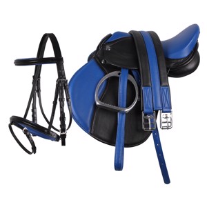 Zadel, singel, stijgbeugelriemen, stijgbeugels en hoofdstel met teugels zijn inbegrepen.
