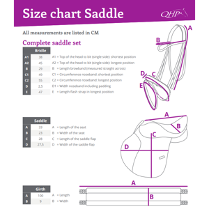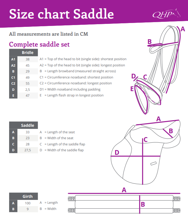 De stijgbeugelriemen zijn 100 cm De singel is 100 cm Het hoofdstel is maat Pony. De stijgbeugels zijn gemaakt van aluminium. Het hoofdstel is gemaakt van geverfd leer en het zadel is een combinatie van leer en kunstleer.