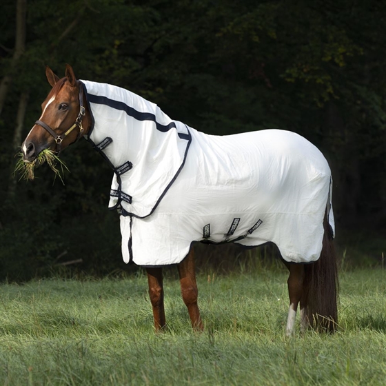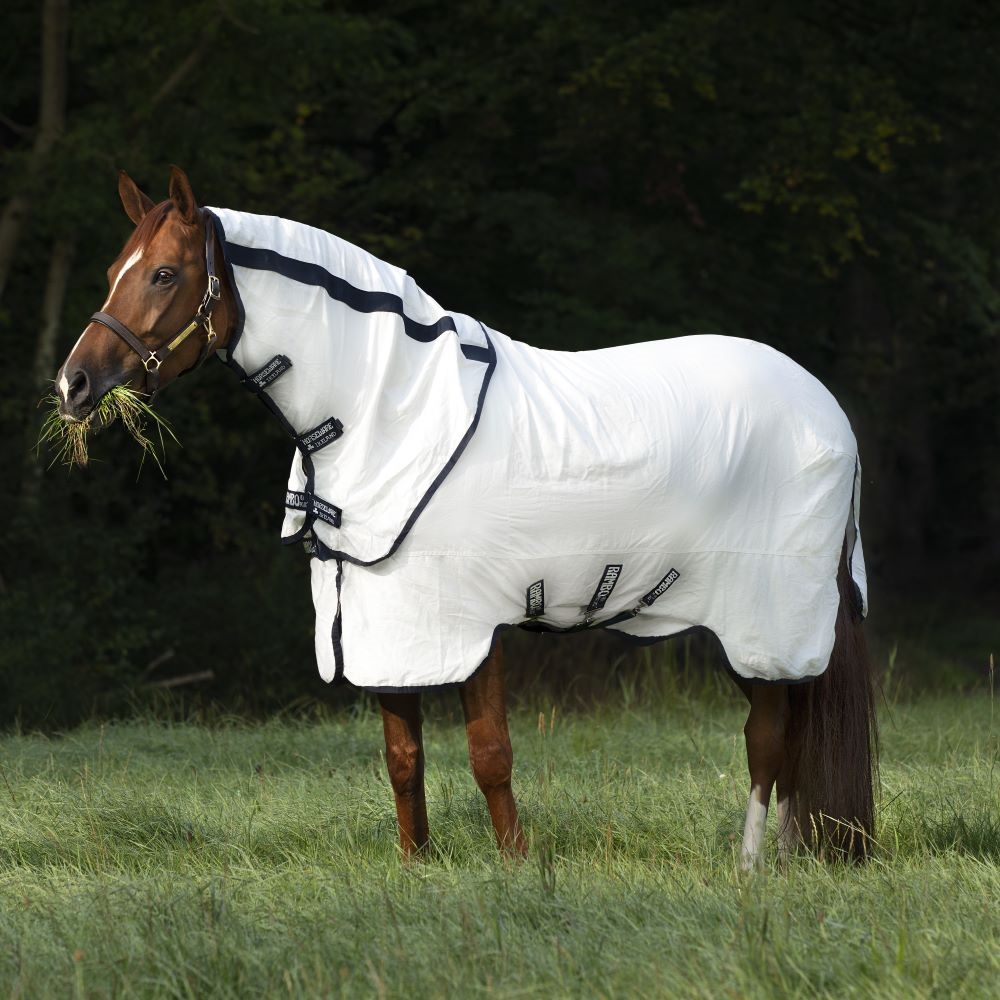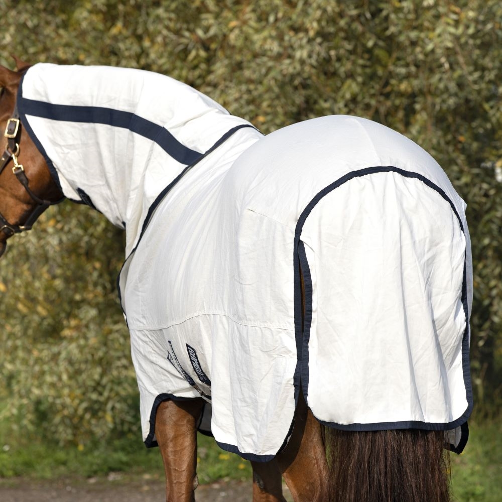 Daarnaast is de deken voorzien van Disc-sluiting aan de voorkant, afneembare hals, 3 singelriemen, beenuitsparingen voor maximale bewegingsvrijheid van de benen, en een PVC-staartkoord.