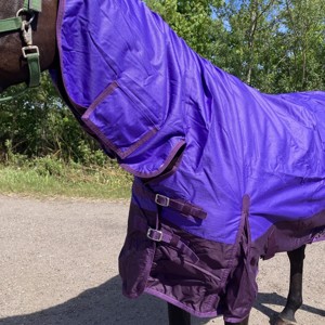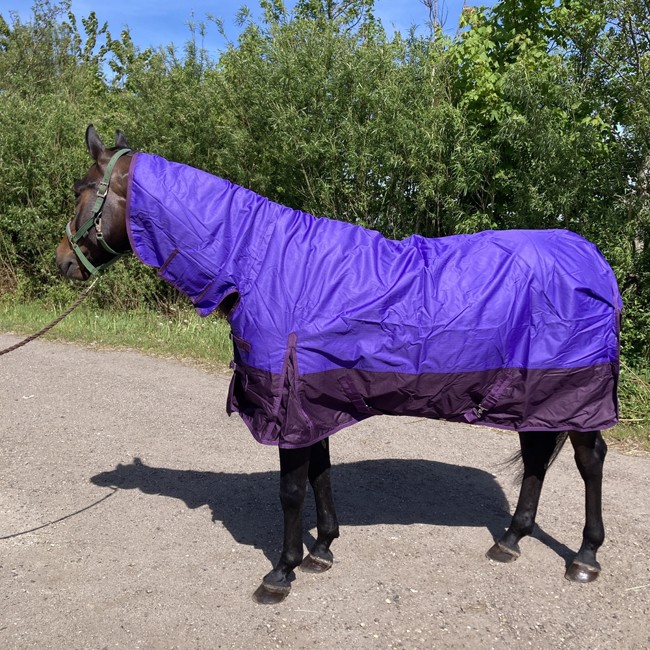 Regendeken met 50 gram vulling en vaste hals 600 Denier buitenkant, en gladde nylon voering aan de binnenkant. Verkrijgbaar in kleur: Lavender/Purple - Pista Aqua/B.Green - Navy/Grey - Raspberry/Grey - Purple/Plum Verkrijgbaar in maat: 125 - 130 - 135 - 145 - 150 - 155 cm