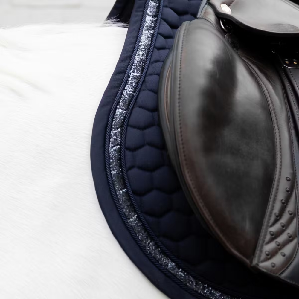 De glamoureuze glitterband geeft een unieke, opvallende uitstraling. Perfect voor de ruiter die wil opvallen met stijl, zonder concessies te doen aan kwaliteit en comfort. Daarnaast is het zadeldek ontworpen met extra ruimte voor persoonlijke details zoals naam of logo.