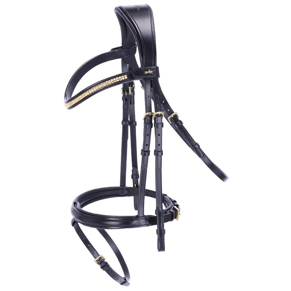 Dit hoogwaardige hoofdstel combineert doordachte functionaliteit met elegant design. De gevormde Engels gecombineerde neusriem zorgt voor optimale drukverdeling en een comfortabele pasvorm. Een bijzonder praktische detail is de afneembare kaakriem, die discreet is bevestigd met een verborgen lus. Het nieuwe anatomische kopstuk biedt extra comfort en ondersteunt de bewegingsvrijheid van het paard.