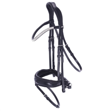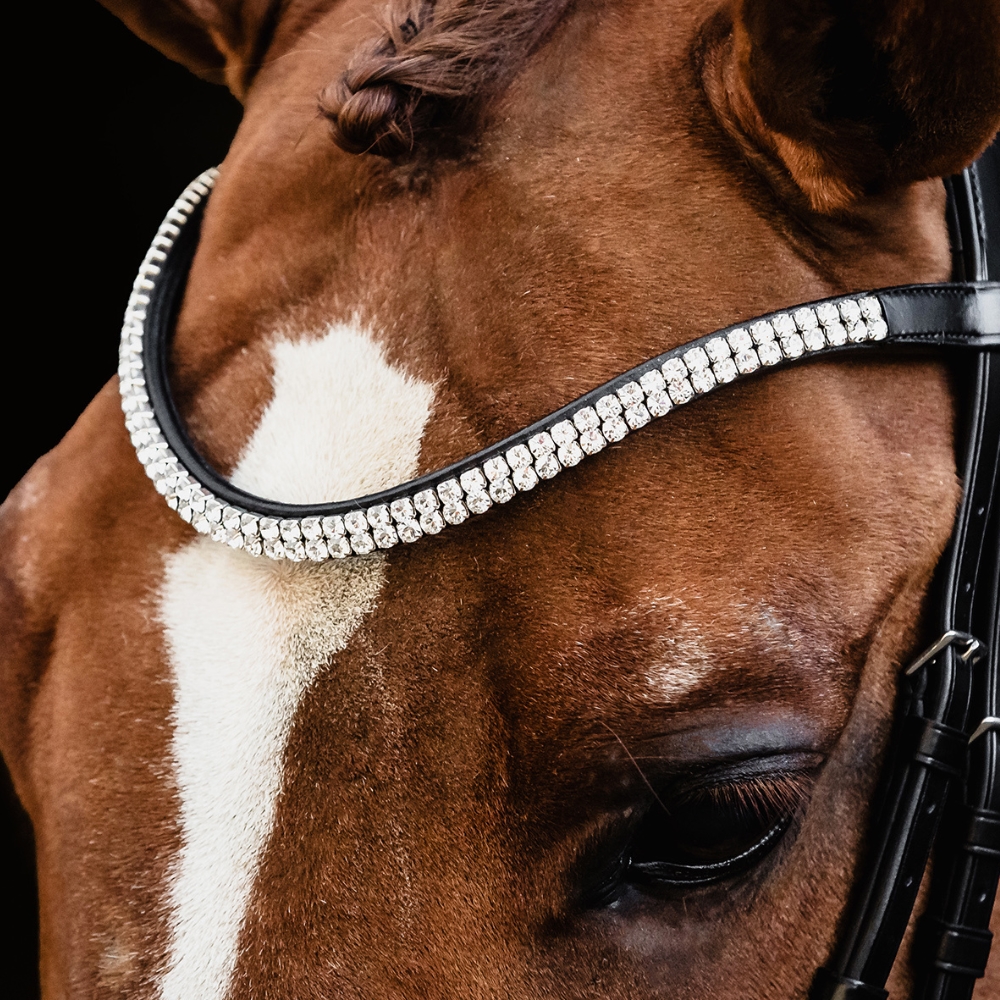 Het slanke frontriem met twee rijen hoekige kristallen geeft het hoofdstel een verfijnde, fonkelende afwerking.