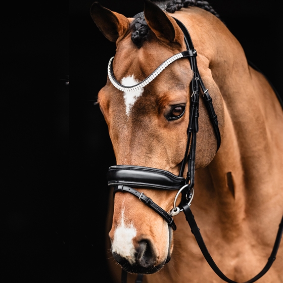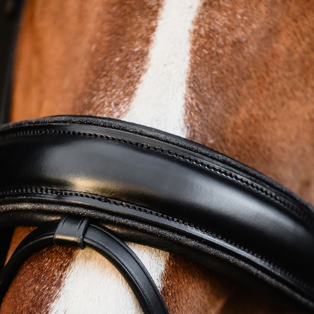 De speciaal ontworpen neusriem met jukbeenuitsparing biedt een zachte pasvorm en voorkomt drukpunten. Een subtiele glitterpiping voegt een vleugje elegantie toe, terwijl de zachte voering op het kopstuk, de neusriem en de gevoerde D-ringen het algemene comfort verbeteren.