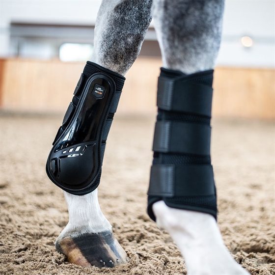 De technische trainingsbeschermers van Schockemöhle Sports zijn een must-have voor elke trainingssessie! De binnenkant van de voorbenen wordt beschermd door een harde schaal, terwijl meshmateriaal en bamboevoering zorgen voor temperatuurregulatie dankzij de ventilatiegaten rondom de benen van het paard. De beschermers zijn ademend en luchtdoorlatend. Het uiterlijk wordt gecompleteerd door het logo aan de binnenkant en een sluiting van kunstleer.