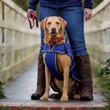 De hondenjas heeft verstelbare klittenbandsluitingen en biedt volledige buikbescherming. Grote kraag, elastische beenriemen en opening voor hondenriem.