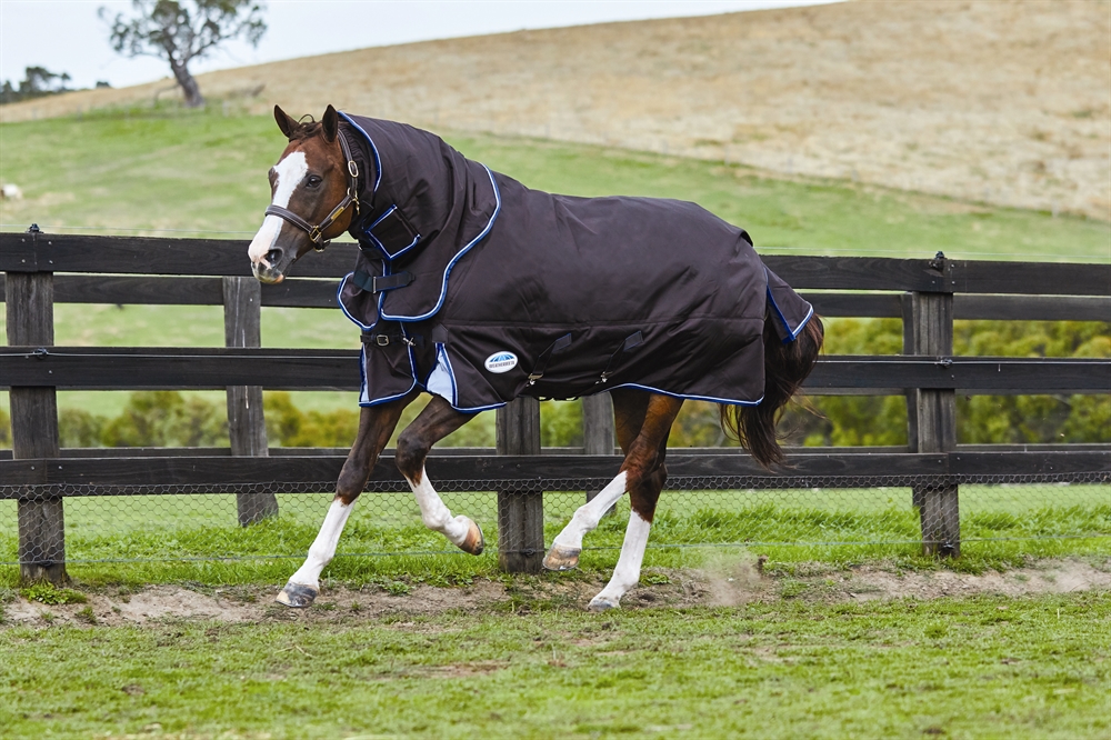 De deken heeft bovendien een extra grote staartflap met een tweedelig ontwerp en reflecterende inzet, zodat deze volledig beschermt wanneer het paard zijn achterwerk naar de regen keert. Verstelbare, gevoerde afneembare bilkoorden, die een veilige en comfortabele pasvorm bieden.