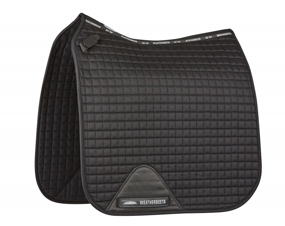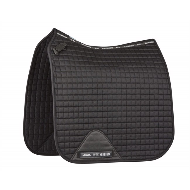 Klassieke dressuurzadeldoek van Weather Beeta met ademende, absorberende en sneldrogende binnenkant, zodat de zadeldoek niet nat wordt wanneer het paard zweet. De zadeldoek is gemaakt van sterk katoen met een anatomisch correcte ruglijn en mesh op de ruglijn voor extra ventilatie en comfort. Het model heeft extra lengte voor perfecte pasvorm en is voorzien van korte riemen, perfect voor monoflap zadels, evenals versterking bij de singel en met singellussen. Wasbaar in de machine op 30 graden en mag NIET in de droger.