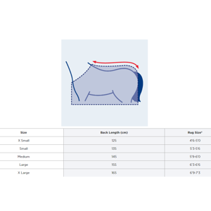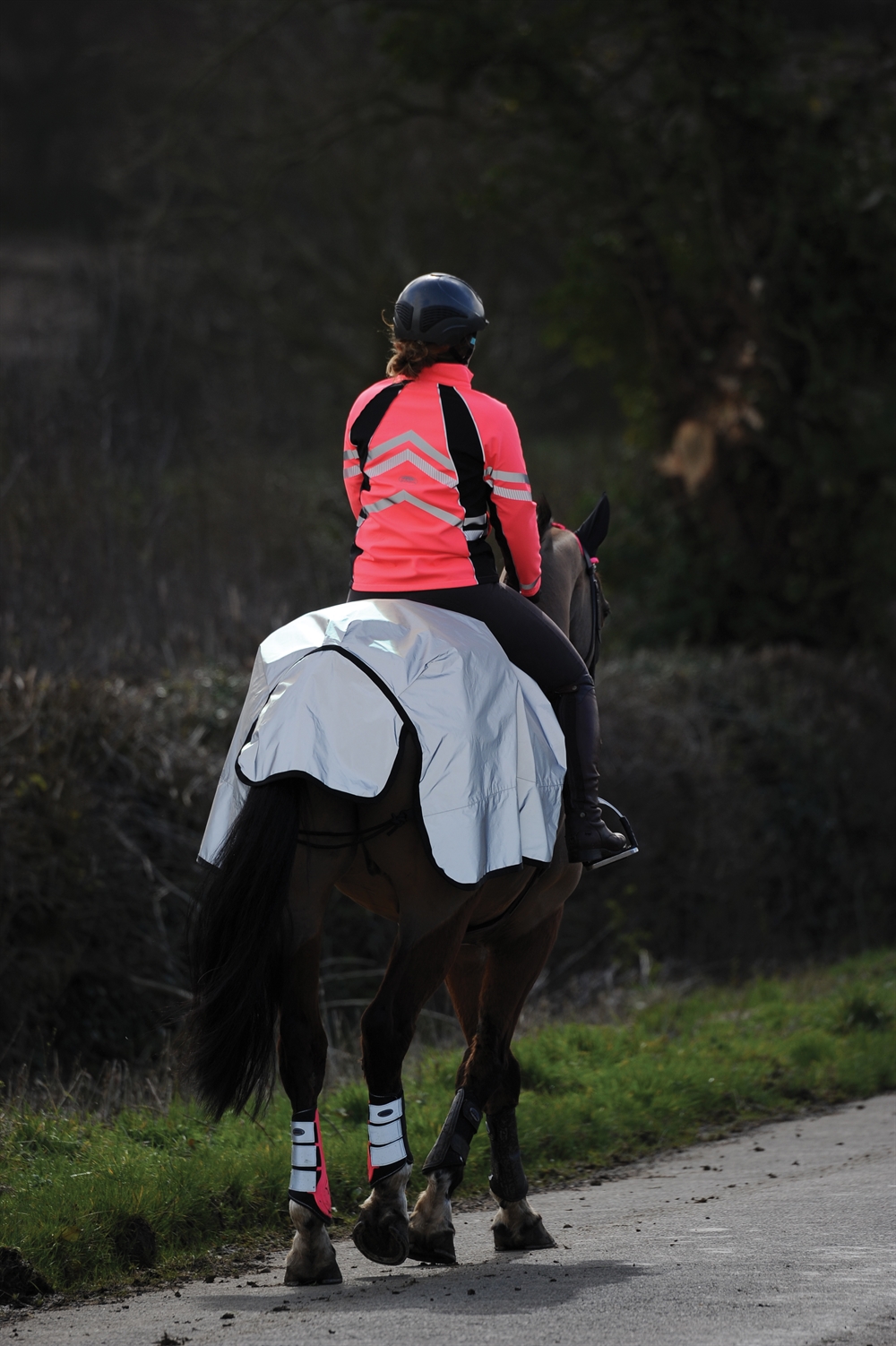 Velcrosluiting bij de borst, uitsparing voor het zadel, staartflap en staartkoord.